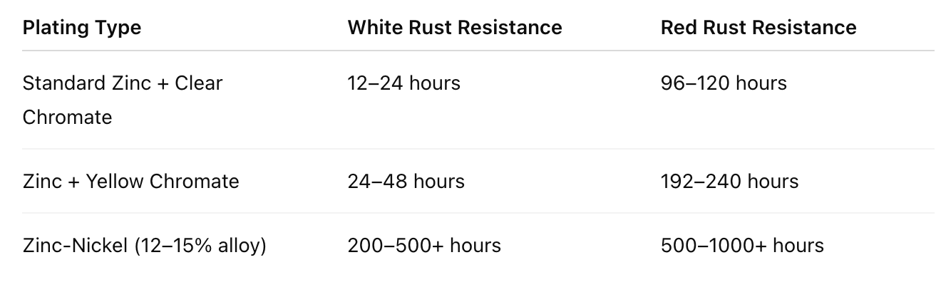 - Salt spray environments (e.g., coastal, automotive): Standard zinc may corrode quickly—zinc-nickel is often a better choice here.